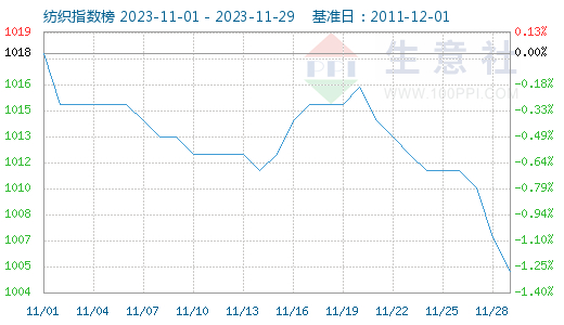 从行业来看,生意社纺织指数显示11月份纺织行业震荡下行,截止11月29日纺织指数为1005点,较11月1日1018点下降了13点。1—10月,全国限额以上单位服装鞋帽、针纺织品类商品零售额同比增长10.2%。规模以上企业纱、布、服装产量同比分别下降1.2%、4.2%、10.1%,化纤产量同比增长8.8%。出口方面,1—10月,我国纺织品服装累计出口2457亿美元,同比下降9.2%,其中10月当月出口230亿美元,同比下降4.8%。