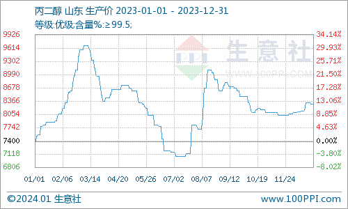根据生意社监测数据显示,截止2023年12月31日,国产工业级丙二醇市场价格参考在8300元/吨,与1月1日(丙二醇参考价格7400元/吨)相比,价格上调900元/吨,涨幅12.16%。2023年国内丙二醇市场行情整体呈现宽幅震荡。全年中,价格低点参考7133元/吨,年内最大跌幅26.90%。