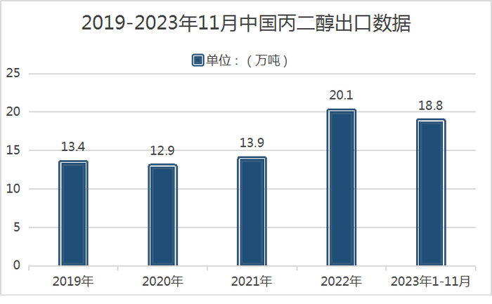 出口方面:中国是全球主要的丙二醇出口国之一,中国出口前三的国家和地区分别为土耳其、阿联酋和印度尼西亚。《财政部 税务总局公告2020年第15号》公告自2020年3月20日起实施,提高部分产品出口退税率,其中丙二醇出口退税率提高至13%,政策利好丙二醇出口。2023年1-11月,丙二醇的出口量达18.84万吨,同比增长了9.45%。2021至2023的三年,丙二醇出口占比逐年增长。预计2024年,丙二醇出口仍有增长趋势。