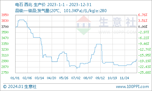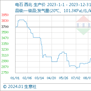 据生意社商品行情分析系统,2023年西北电石震荡下跌,整体下行。年初平均价格为3700元/吨,年底均价为3016.67元/吨,全年跌幅18.47%。由电石价格走势图可以看出,2023年电石最高价为1月中旬的3850元/吨,最低价为7月上旬的2850元/吨,全年最大跌幅为25.97%。