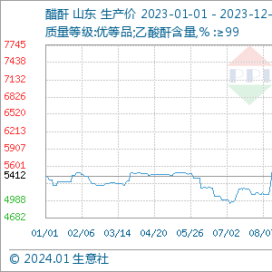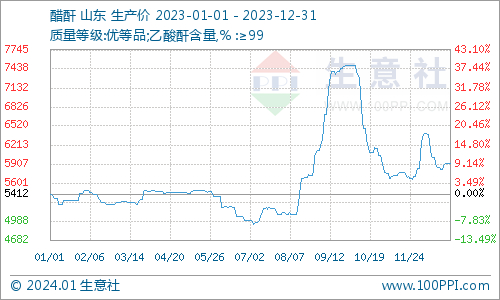 据生意社商品行情分析系统,截止2023年12月31日,醋酐价格5912.5元/吨,较2023年1月1日醋酐价格5412.5元/吨上涨,涨幅9.24%。2023年醋酐走势分为三个阶段:1-7月份,醋酐低位窄幅盘整;8-10月份,醋酐暴涨暴跌;11月-12月,醋酐宽幅盘整。2023年醋酐价格最高点为10月1日的7490元/吨,最低点为7月5日的4937.50元/吨,最大振幅51.70%。总体2023年醋酐宽幅盘整,年末醋酐价格强势收尾。