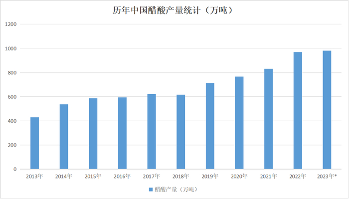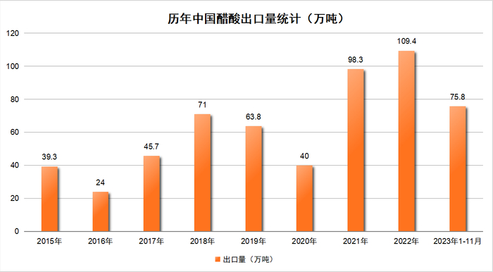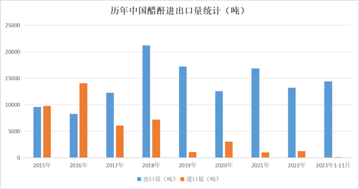 据海关总署发布数据显示,自2015年以来,醋酸年出口量虽有增减,但总体向上,醋酸出口量震荡上涨。受国际油价和天然气价格上涨、欧美装置老化、欧美新增产能少等原因影响,醋酸2021年、2022年出口量激增,且出口量占产量比重超10%。随着天然气价格下降、海外醋酸装置恢复开工,醋酸出口量下降。2023年醋酸出口量同比大幅下降,醋酸出口对醋酸行业支撑不足。