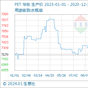 2023年PET整体市场跌宕起伏,价格有涨有跌,2023年PET有两个价格上涨阶段,第一季度和第三季度,第一季度PET呈现窄幅上行的走势,截止3月末,生意社均价是7690元/吨,第一季度价格整体上涨了7.25%,涨势最快的时间段是1月中旬,2023年1月份是中国的传统节日春节,春节的到来,促进了瓶装水和瓶装饮料的消耗,PET下游需求明显提升,原料走势向好,价格主要以上涨为主,第二季度,生意社PET均价是7360元/吨,价格处于小幅下行的走势,价格低点实在7月中旬,截止7月末市场主流价格在7400元/吨左右,第二季度的整体跌幅是4.29%。