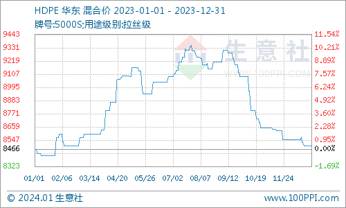 2023年LLDPE年初均价8392元/吨,年底均价8237元/吨,全年跌幅1.86%,2023年LDPE年初均价9100元/吨,年底均价9082元/吨,全年跌幅0.19%,2023年HDPE年初均价8466元/吨,年底均价8500元/吨,全年涨幅0.39%。