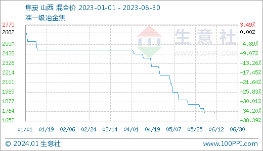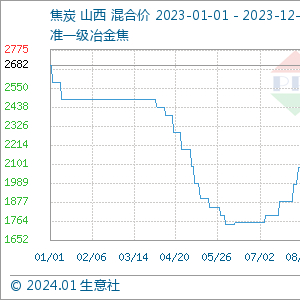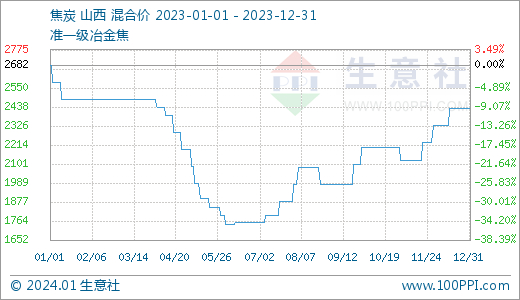 据生意社商品行情分析系统:2023年国内焦炭市场均价年初在2682元/吨,年末在2430元/吨,年度跌9.4%。其中年内自高点出现在1月1日2682元/吨,年内最低点出现在6月2日2430元/吨,年内最大振幅34.9%。焦炭市场2023年整体走势偏弱,基本分为两个阶段,上半年下跌,下半年上涨。