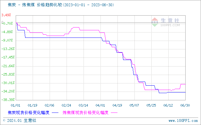 2023年上半年焦炭市场年初2轮提降落地后,连续2个半月价格保持平稳运行,在进入4月后连续下跌10轮,2023年上半年焦炭市场累计提降12轮,累降约950元/吨,上半年累计下跌34.6%。