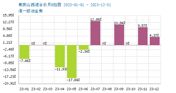 从生意社焦炭月K柱图来看,2023年焦炭价格涨跌参半,上行月份4个月,下行月份4个月,保持平稳4个月,其中最高涨幅在7月上涨12.881%,最高跌幅在5月下跌17.84%。
