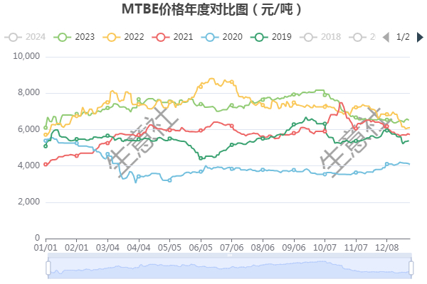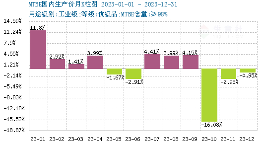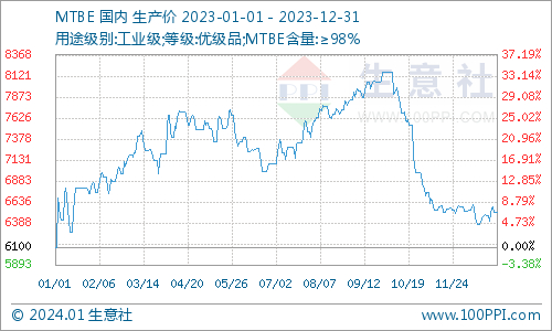 首先回顾一下2023年MTBE市场走势,2023年国内MTBE市场行情强势震荡,年初平均价格为6100元/吨,年底均价为6512元/吨,全年涨幅6.76%。由MTBE价格走势图中可以看出,2023年MTBE价格最高点出现在10月份,最高价格为8162元/吨,MTBE价格最低点出现在年初,最低价格为6100元/吨,最大振幅为33.81%。