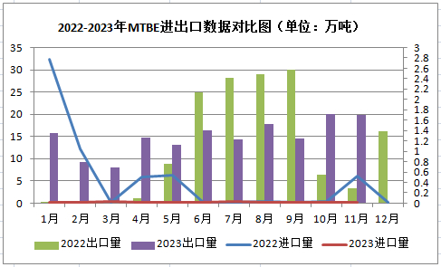 进出口,2022年MTBE出口表现亮眼,且这一强势表现延续至2023年,对于缓解国内供应压力起到了较为明显的作用。但当前需求呈现偏弱格局,国际市场整体偏弱,将会对MTBE出口产生一定不良影响,同时如果要提升国内MTBE在国际市场上的竞争力,也会导致MTBE价格受到一定压制。2023年MTBE进口量由5.6万吨锐减至2496吨,出口量同比增长23%至184万吨,进口量创历史新低而出口量创历史新高。2024年MTBE出口方面呈利好因素影响。