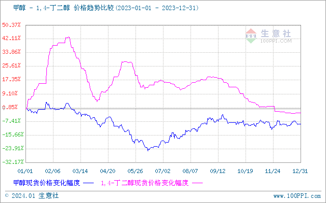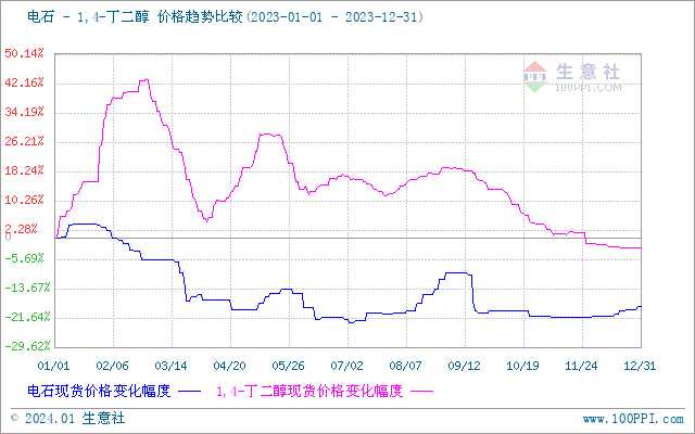 首先回顾一下2023年BDO市场走势,2023年国内BDO市场行情高位回落,年初平均价格为9780元/吨,年底BDO均价为9535元/吨,跌幅2.50%。由BDO价格走势图中可以看出,2023年BDO最高价出现在2月底,最高价格为14033元/吨,BDO价格最低点出现在年末,最低价格为9535元/吨,最大振幅为47.17%,整体来看国内BDO走势上半年波动剧烈,下半年震荡走低为主。