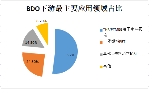 需求面,BDO下游主要有四氢呋喃(THF)、聚对苯二甲酸丁二醇酯(PBT)、聚对苯二甲酸-己二酸-丁二醇酯(PBAT)、聚丁二酸丁二醇酯(PBS)和γ-丁内酯(GBL)等产品。THF/PTMEG(聚四氢呋喃)主要用于生产氨纶,是BDO下游最主要应用领域,消费占比接近52%。工程塑料PBT和高沸点有机溶剂GBL是BDO当前另外两个主要消费领域,占比分别为24.5%和11.8%。