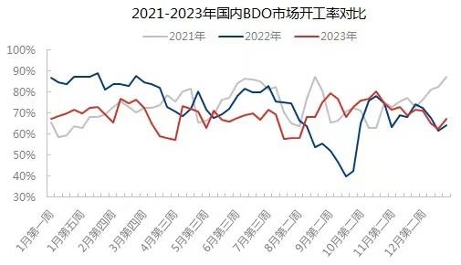 具体来看,2023年开年,受生产企业装置检修及竞拍价格高位拉动,同时下游行业随着需求逐步恢复及成面支撑偏强带动,行情多数偏上运行;贸易商持货货源有限,多数封盘不报,另外出口市场良好,带动国内BDO行情整体上移。随着主要生产企业新疆新业、国泰新华装置陆续重启,供应端增量较多,BDO供应层面存利空,下游行业成本承压,BDO行情“到头向下”。