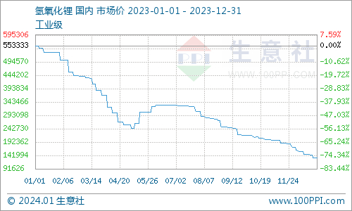 2023国内氢氧化锂市场低迷运行。据生意社商品行情分析系统,2023年1月1日国内工业级氢氧化锂企业均价为553333.31元/吨,12月31日国内工业级氢氧化锂企业均价为133600.00元/吨,年内行情下跌75.86%。