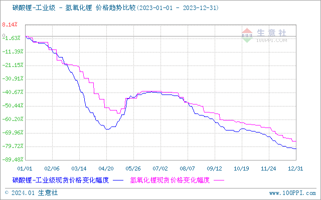 据生意社商品行情分析系统监测:2023年碳酸锂价格下跌。截至2023年12月31日工业级碳酸锂国内混合均价价格为94000元/吨,与1月1日均价504000元/吨相比下降了81.35%。由上图可以看出,2023年氢氧化锂与上游碳酸锂走势基本趋同,碳酸锂行情对氢氧化锂市场影响较大。