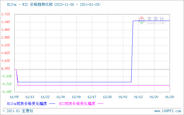 1月终端下游制冷剂产品行情略有上涨,制冷剂行业开工率维持低位,对于原料采购不积极,制冷剂R22生产厂家负荷不高,下游采购刚需跟进,部分生产企业逐步累库,新年逐步降低供应,减少供给压力,经销商采购需求不足,R22价格行情维持低位为主。制冷剂市场配额周期开启,企业惜售情绪难以改变,国内R134a配额较为紧俏,部分厂家上调出厂价格,制冷剂R134a目前市场报价多在28000-29000元/吨区间,制冷剂行业整体成交相对平淡,制冷剂行业开工维持低迷,需求一般,受此影响萤石行情价格走低。