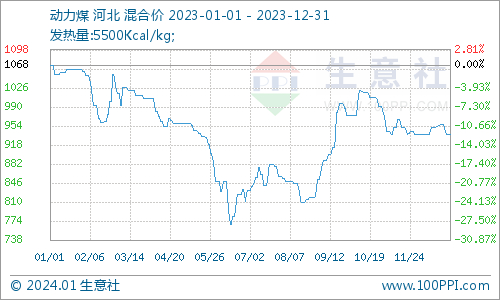 据生意社商品分析系统显示,2023年动力煤价格涨涨跌跌,整体下行。年初价格1068.75元/吨左右,年末价格939元/吨左右,价格下跌12.14%。