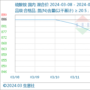 本周国内硫酸铵市场价格下跌。目前硫酸铵市场交投低迷,下游刚需采购,对高价有抵触心理,多低价成交。出口行情不佳,利空国内市场,厂家和经销商看空情绪明显。截至3月14日,焦化级硫酸铵,山东地区主流出厂报价795元/吨左右。己内级硫酸铵,山东地区主流出厂报价850-890元/吨左右。