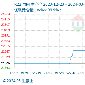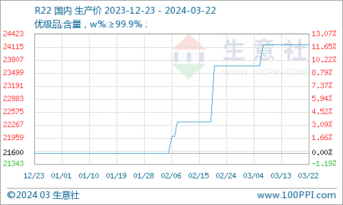 据生意社商品行情分析系统,截止3月18日,制冷剂R22均价为24166.67元/吨,较月初价格23666.67元/吨上涨2.11%,与去年同期相比上涨16.00%
