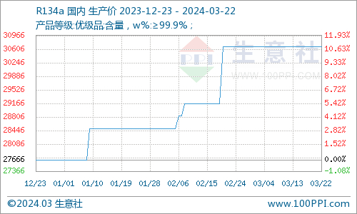 据生意社商品行情分析系统,截止3月18日,制冷剂R134a均价为30666.67元/吨,较月初价格持平,与去年同期相比上涨20.26%。