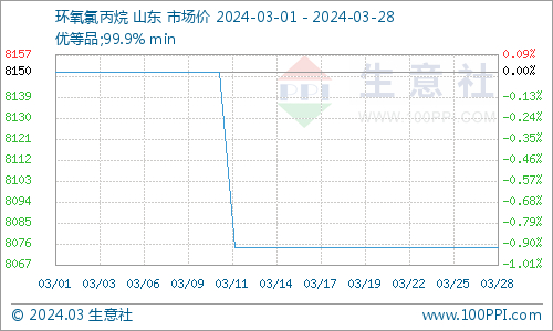 3月份,环氧氯丙烷市场行情下跌。据生意社商品行情分析系统,截止到3月28日环氧氯丙烷企业报价均价为8075.00元/吨,与3月1日(环氧氯丙烷参考价为8150.00元/吨)价格相比,下跌0.92%。