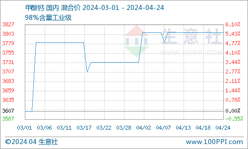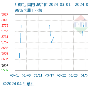 本周(4.16-4.24),甲酸钙市场行情大致稳定。据生意社商品行情分析系统,截止到4月24日国内工业级98%甲酸钙报价均价为3807.50元/吨,与上周价格相比,基本持平。