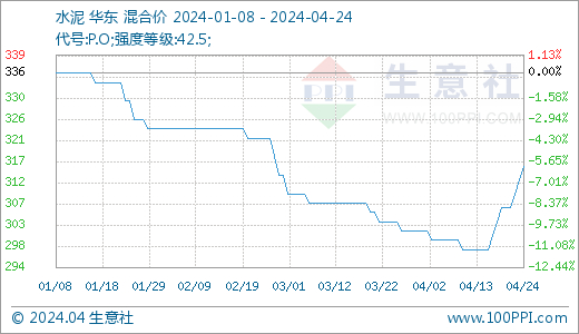 据生意社商品行情分析系统显示,近期华东地区水泥弱势下跌,周初价格为298.00元/吨,周末价格为304.00元/吨,上涨了2.01%,环比下跌了1.30%,当前价格同比去年下跌了27.96%。