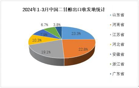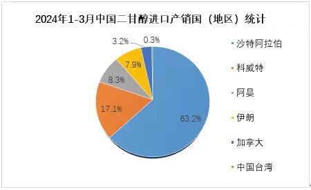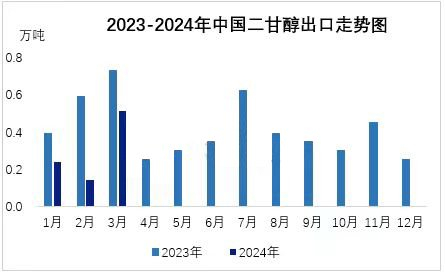 2024年一季度,我国二甘醇累计出口量为0.89万吨,比去年同期减少0.82万吨,降幅47.9%。其中1月份出口量为0.24万吨,2月份出口量为0.14万吨,3月份出口量为0.5万吨,因3月份国内二甘醇装置开工负荷较高,产量增加明显,故出口增量明显。