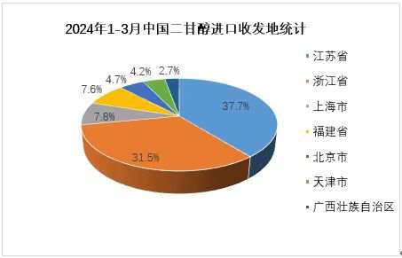 进口收发地前三名为江苏省、浙江省和上海市。其中,江苏省是国内二甘醇贸易主流省份,同时拥有下游UPP产能较大,进口量为4.15万吨,占比37.7%,排名第一;第二名是浙江省,进口量为3.47吨,占比31.5%,上海市排名第三,进口量为0.85万吨,占比8%左右。