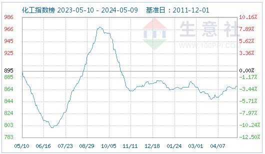 化工指数:5月9日化工指数为870点,与昨日持平,较周期内最高点1400点(2021-10-23)下降了37.86%,较2020年04月08日最低点598点上涨了45.48%。(注:周期指2011-12-01至今) 。