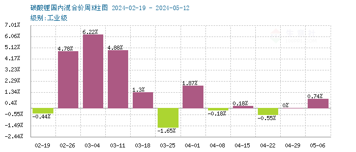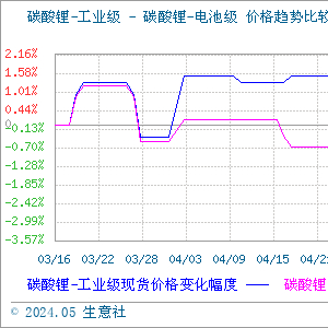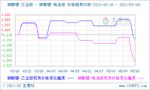据生意社商品行情分析系统监测:本周工业级碳酸锂和电池级碳酸锂价格止涨下行。5月16日工业级碳酸锂国内混合均价为106800元/吨,与5月12日均价109200元/吨相比下降了了2.2%。5月16日电池级碳酸锂国内混合均价为113000元/吨,与5月12日均价116200元/吨相比下降了2.75%。