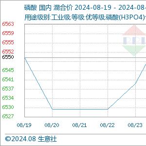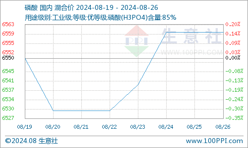 本周国内磷酸市场上涨。截至8月26日,湖北地区85%热法磷酸出厂报价在6500-6700元/吨左右,四川地区85%热法磷酸出厂报价在6600元/吨左右。国内85%湿法磷酸市场报价在6800-6900元/吨左右。