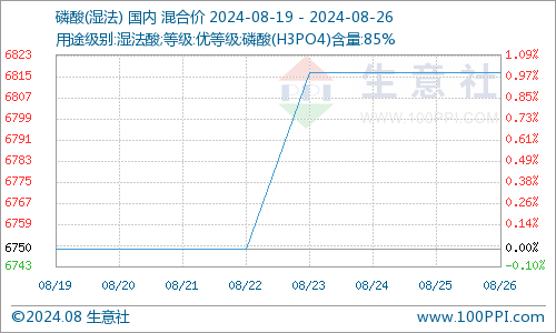 据生意社商品行情分析系统,截止8月26日,国内85含量湿法磷酸参考均价为6816元/吨,较8月19日参考均价6750元/吨,国内湿法磷酸价格上涨0.99%。
