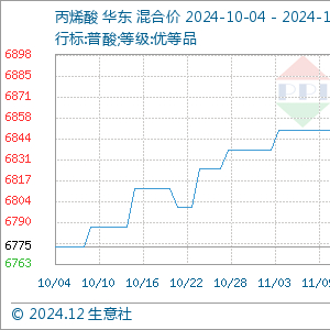 整体趋势:丙烯酸市场价格近期呈现波动趋势。例如,从2024年11月25日至12月3日,丙烯酸全国主流市场均价在6668.75元至6762.50元/吨之间波动,其中11月27日至12月3日出现小幅震荡。