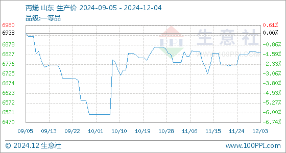 丙烯作为丙烯酸的主要原料,其价格波动直接影响丙烯酸的生产成本。近期丙烯市场价格较为稳定,全国均价可能在6700元/吨至6850元/吨之间,具体价格需根据地区和交易条件而定。