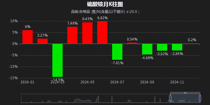 根据2024年月K柱图可以看出,2024年硫酸铵年内最大涨幅为6月份,涨幅为9.92%。年内最大跌幅是3月份,跌幅为14.5%。
