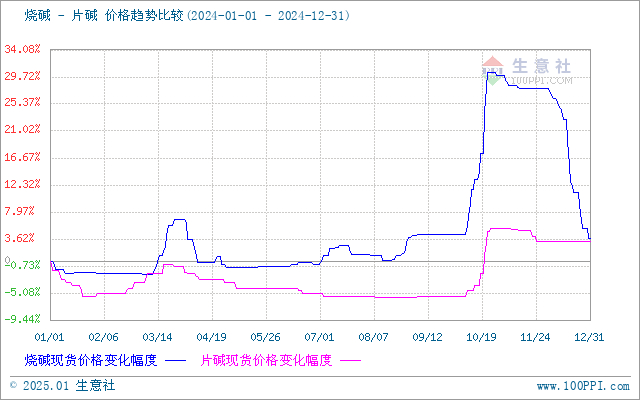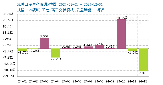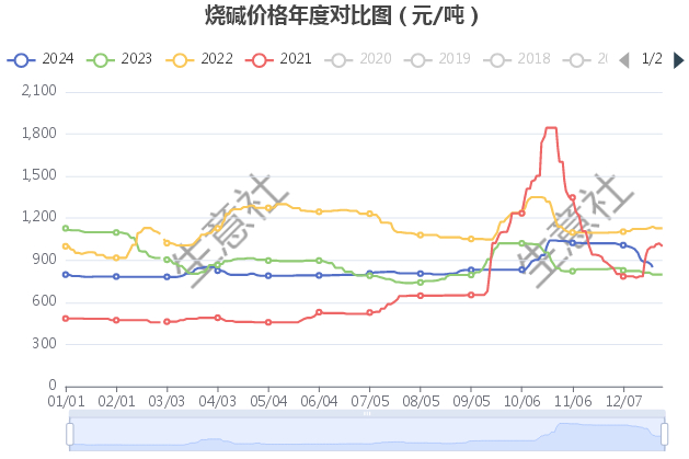 从烧碱年度价格对比图可以看出烧碱价格历史最高位出现在2021年11月份中旬左右,价格是1820元/吨左右。2024年价格最高1041元/吨左右。本年度烧碱价格最高点没有突破历史高位。从烧碱年度价格对比图可以看出,2024年上涨7月份,下跌5个月份。上涨幅度最大是10月份,达到24.49%,下跌幅度最大是12月份,达到19%。