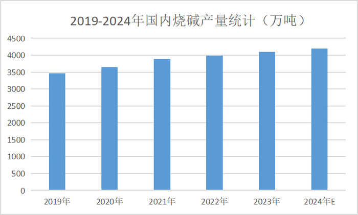 2024年中国烧碱产能4845万吨,环比增加3.01%。受产能增加影响,1-11月烧碱产量较去年同期大幅增长,国家统计局数据显示,2024年1-11月份,国内烧碱产量为3981万吨,较去年同期正价254万吨,增幅为6.82%。2024年产量预计4200万吨。
