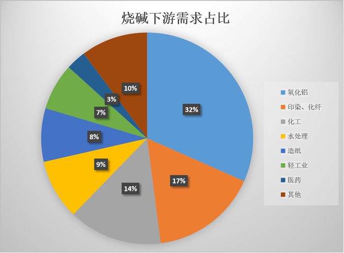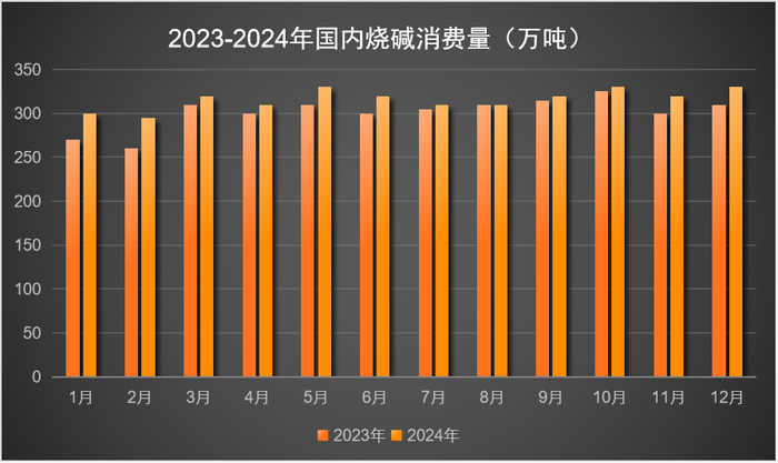 烧碱下游消费领域繁多,主要包括氧化铝、印染化纤、化工、轻工业、造纸、石油等,其中,氧化铝为占比最大的消费领域,比重接近32%;印染化纤17%、化工14%,分列二、三位。其余各行业较为分散,占比不足10%。2024年氧化铝价格逐渐偏强运行,支撑烧碱四季度烧碱价格上涨。2024年国内氧化铝新增投产705万吨,其中一季度增加55万吨,二季度增加365万吨,三季度增加150万吨,四季度拟增加135万吨。国家统计局数据显示,2024年1-11月国内氧化铝累计产量为7809万吨,较去年同期增加249万吨,增幅3.3%。非铝需求增量有限,2024年纸浆市场持续低迷,有230万吨新增产能投产,折合烧碱需求使用量约32万吨。2025年,纸浆折合烧碱需求增量约18万吨,从纺织行业来看,2024年粘胶短纤企业开工率较高,新能源行业也是2024年烧碱需求的主要增长点,2025年国家仍会对新能源行业提供强力支持,也会给烧碱需求带来支撑。