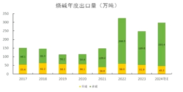 我国是烧碱净出口国,总体来看进出口依存度均不高,对国内市场来讲,进出口只是供需平衡的调节途径之一。国家统计局数据显示2024年1-11月烧碱进口量为6259吨,2024年1-11月烧碱出口量230万吨,2024年出口量约为300万吨。