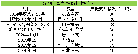 数据预计2024年国内烧碱消费量为3823.32万吨,较去年增加194.12万吨,2025年氧化铝、纸浆、新能源等下游产能释放,对烧碱需求量仍有增加。其中2025年将迎来氧化铝行业投产高峰,目前计划投产产能达到1280万吨,折 合烧碱需求增量约192万吨。