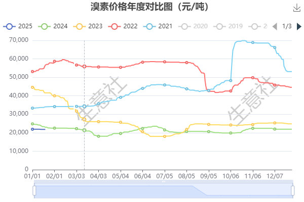 看一下溴素的年度对比图,从年度对比图可以看出,溴素价格本年度整体弱势运行,其价格差不多处于5年的历史低位。