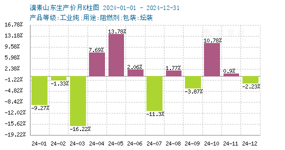 从溴素的月k柱图可以看出,2024年上涨6个月份,下跌6个月份。其中涨幅最大的是5月份,价格上涨13.78%,跌幅最大的是3月份,价格下跌16.22%。