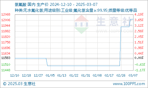 本周国内氢氟酸价格小幅上涨,国内氢氟酸各地区商谈主流价格为11300-11800元/吨。下游氢氟酸部分装置仍处于停车中,氢氟酸现货供应变化不大,厂家氢氟酸按需采购为主,氢氟酸整体开工维持5成多,氟化氢企业维持刚需订单,以消耗库存为主,氢氟酸市场价格走势上涨,受此消息影响萤石价格行情走高。