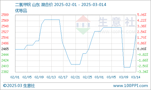 本周(3.8-3.14)山东二氯甲烷先跌后涨,波动整理。据生意社商品行情分析系统显示,3月14日山东地区二氯甲烷散水均价在2520元/吨,周跌幅0.98%。