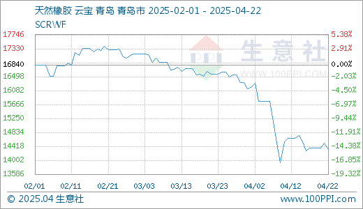 据生意社商品行情分析系统,近日(4.10-4.22)国内天然橡胶现货行情弱势震荡,截至4月22日我国天然橡胶市场现货胶行情在14350元/吨左右,较10日的14598元/吨下跌1.70%,周期内高点在14735元/吨,低点在14310元/吨。当前受国际贸易消息影响,国内橡胶市场气氛偏弱。原料价格小幅走低;国内天胶港库库存较上期小幅走低但整体仍处高位;下游开工基本稳定;沪胶行情弱势震荡,天然橡胶现货行情震荡调整。