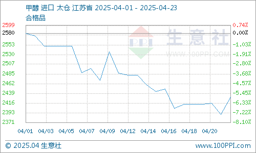 上游原料甲醇价格行情偏强上调。4月23日,国内市场均价在2430元/吨,与昨日价格2390元/吨相比,涨幅1.67%。供应端部分甲醇装置停车,市场供应有所紧张,同时企业库存低位,下游需求尚可,市场交投氛围较好,甲醇行情偏强整理运行。