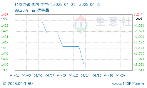 据生意社商品分析系统显示,4月23日轻质纯碱价格持稳,市场均价在1400元/吨,与上一交易日价格1400元/吨相比持平,较月初跌幅2.37%。