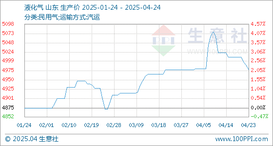 4月24日,生意社液化气基准价为4977.50元/吨,与本月初持平。