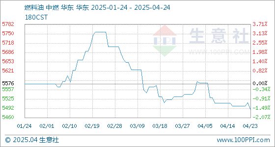4月24日,生意社燃料油基准价为5487.50元/吨,与本月初(5542.00元/吨)相比,下降了-0.98%。