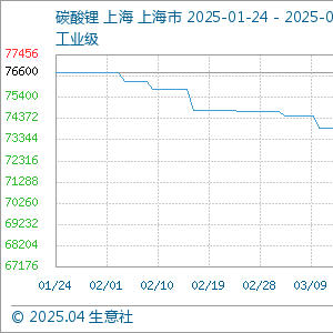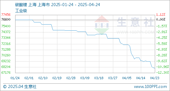 4月24日生意社碳酸锂(工业级)基准价为68033.33元/吨